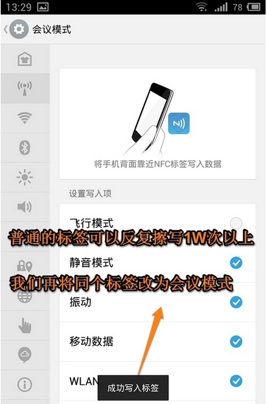 1、有時候我們需要將NFC里的數據更換或者是重新設置,這個時候怎么辦呢?其實方法很簡單的,和“寫入標簽”的方法是一樣的,比如小編要改為“會議模式”。